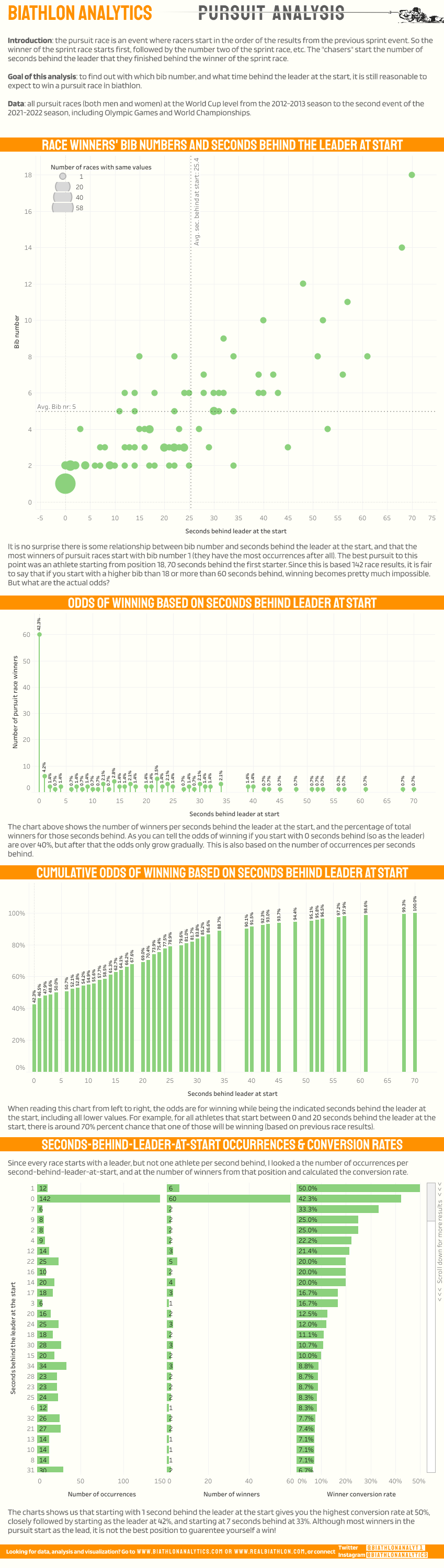 I did an analysis of the 142 pursuit races from the 2012-2013 season up to today (I’m writing this after the 2nd world cup of the 2021-2022 season). I wanted to see what the odds are of winning based on the starting position, expressed in seconds behind the first starter, based on previous results. The outcome was pretty interesting and somewhat unexpected!