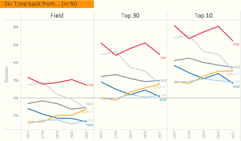Although we can see Canada is closing up the gap a little compared to last season, we are still behind the overall average, and far behind the top 10 athletes. But the positive news is that we made great progress in the 2020-2021 season, indicated by the steep drop towards the averages.