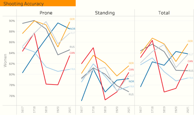 This balance between shooting fast and clean is of course the golden grail of shooting in biathlon (I wrote about this in more depth on this website in December last year). The chart below shows how this balance has changed for the different team, starting in 2016-2017 (thin line) and how teams have moved from shooting more or less accurate, and faster or slower. We see that in 2018-2019 team Canada put a lot of focus on shooting faster, which worked, but at the expense of less accuracy. Now we see that we have lost some speed (but are still very fast) but have gained accuracy. Hopefully, this trend can continue upwards towards more accuracy while remaining fast.