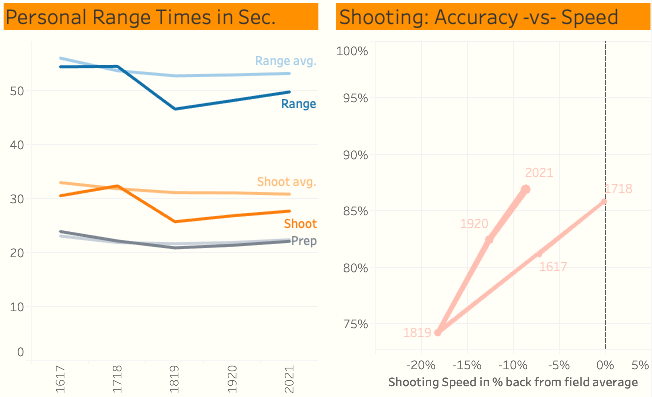 The second part of the evaluation is looking at the individual athletes. All Canadian athletes can be viewed on the interactive dashboard, but here I’m letting Emma Lunder be the example here. We can see that here Accuracy -vs- Speed trend is similar to the Team’s and that she is gaining accuracy while giving up a little speed. But we can also see that here range, shooting and prep time (prep = range – shooting) is still very good and well below the field’s average: