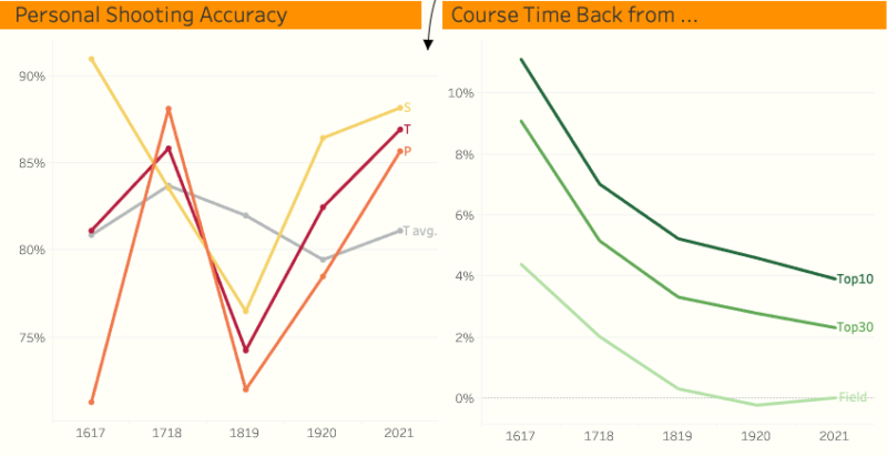 Her total percentage of shooting accuracy (T) has increased mostly based on a strong increase in her prone shooting (P) and she well above the field’s average Total shooting percentage (T avg.). Lastly her skiing speed seems to have stabilized and is on par with the field’s average. But she is also closing the gap with the Top 30 and Top 10 averages.