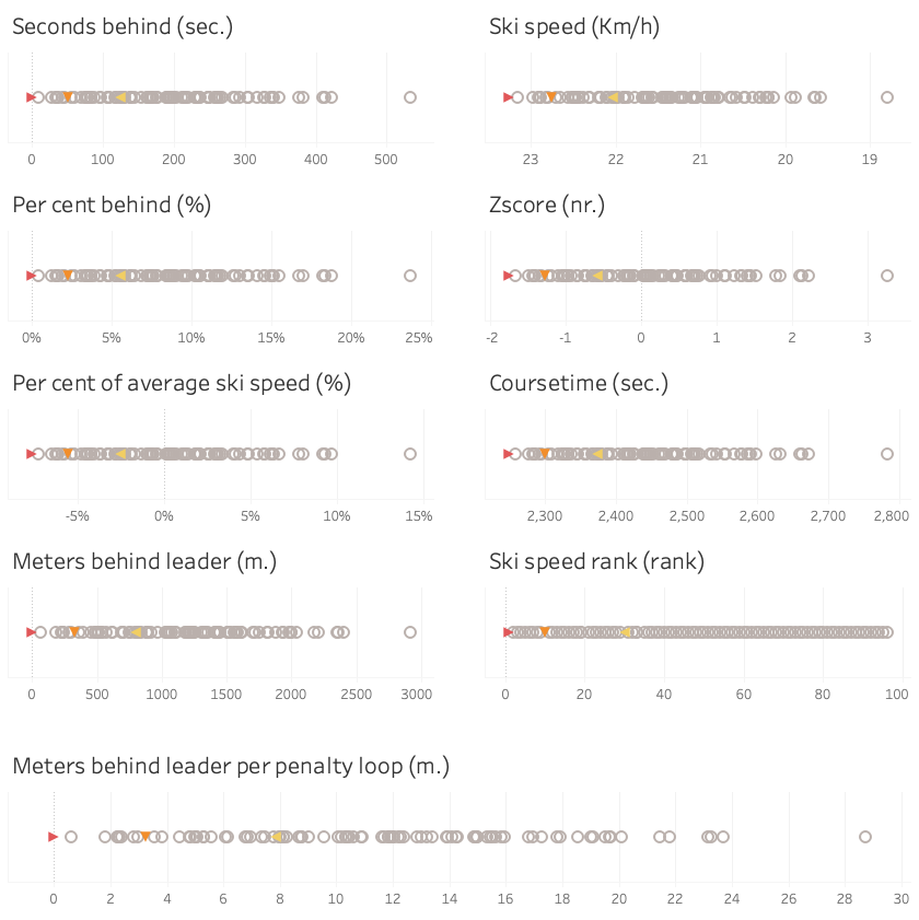 - Per cent of the average of top 5/10/30 skiers: relative measure of the distance between athletes in a percentage of the average ski time of the top 5/10/30 skiers