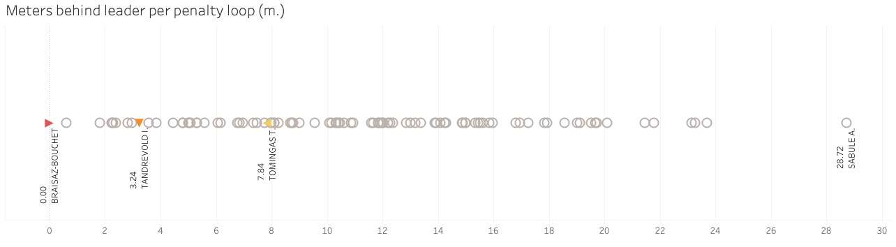 - Meters behind leader per penalty loop: absolute measure of the distance between athletes in meters behind the fastest skier per 150 meters, the length of a penalty loop