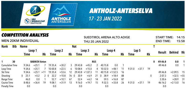 The competition analysis report, available directly from the IBU data center, combines all the time information per athlete per loop and combined: