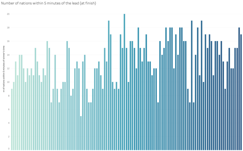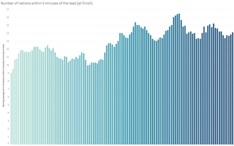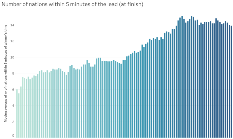 The second chart, with the number of nations within 5 minutes from the winning team, shows an even more wavy pattern. Since about 12-15 seasons ago, the general number of teams has been going up, ranging between 13 and 16, but from there it seems to have stabilized.