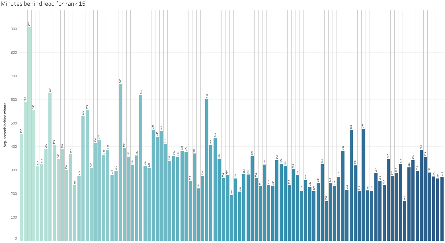 What do you think? Would other ranks and seconds from the winner values be better to use for this analysis? Please let me know on Twitter or use the interactive version of this chart and see for yourself!