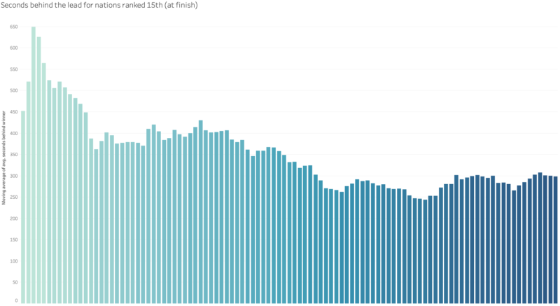 The first chart, about the time behind the leaders for teams ranked 15th, shows that despite some waves going up and down, over time the time behind the leaders has slowly but steadily decreased, from about 500 seconds to between 250 and 300 seconds. That means the 15th ranked teams have gotten 3 to 4 minutes closer in the last 20 years.