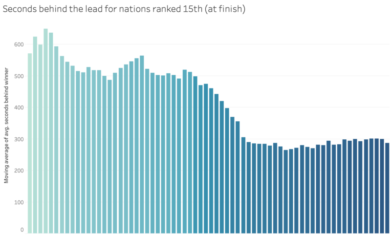 Back to the chart. So since the 2016-17 season, the 15th ranked team was about 270~300 seconds or 4.5 to 5 minutes behind the winning team. Although following a different trend to get there, that is about the same distance in seconds for the men after they settled around the 300-second-level around the 2011-12 season.