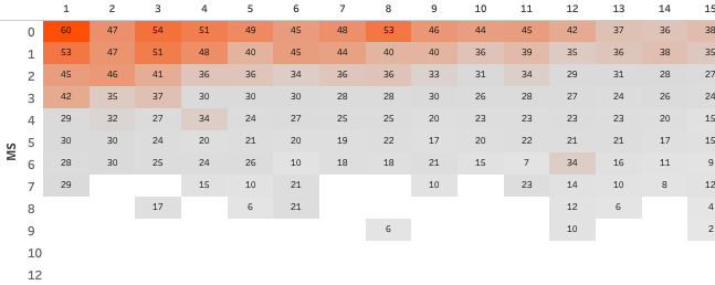 When we turn this chart by 90 degrees and add lines for actual points (AP, green) and expected points (EXP, blue), it shows us Julia’s seasonal trend: