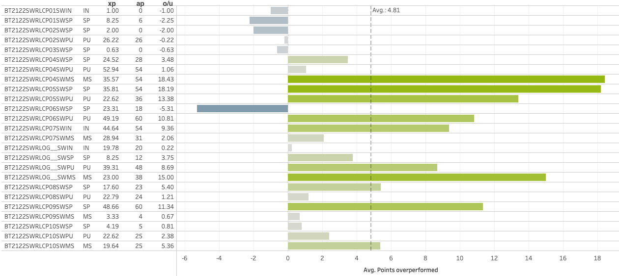 We simply subtract the EXpected Points on any lap during a race from the Actual Points (AP) at the end of that race. This measure tells us if the performance was above or below the expectation for every athlete. Overperformance is therefore defined as the actual points above the expected points. A negative value for overperformance simply indicates that the actual points were lower than the expected points. This can also be referred to as underperformance.