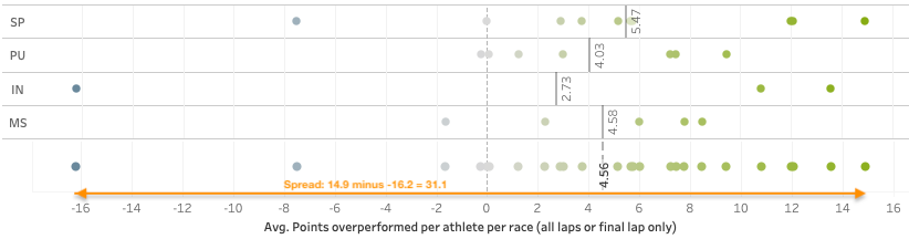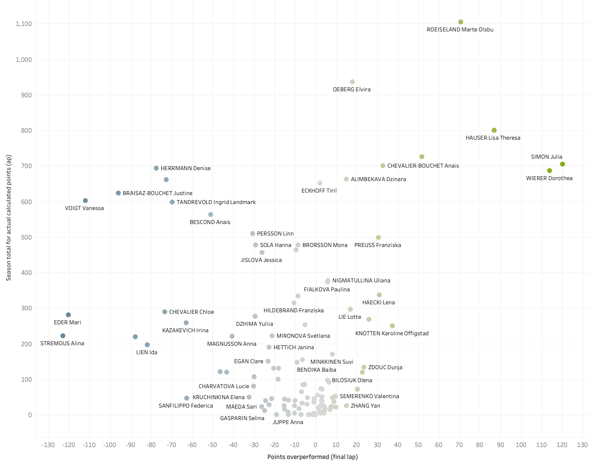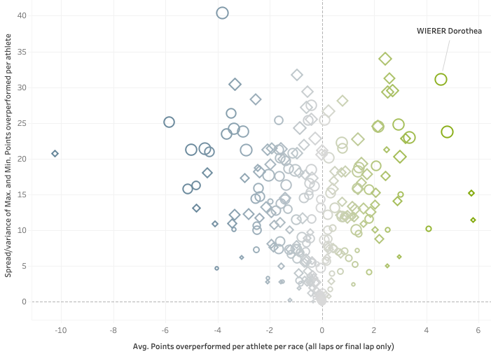 The last charts of this article shown below, also available interactively in the W.E.I.S.E. version 2 dashboard, show all athletes of the 2021-22 season plotted based on their average points overperformed per race (final laps only), and their overperformance spread: