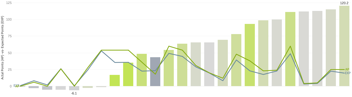 Analyzing the past season, the athletes who overperformed did very well. Alternatively, when looking at the season ahead, athletes that underperformed last season could have expected to do better. So with some specific improvements over the summer, and perhaps some better luck, they may be able to make huge jumps next season if they can perform up to or above their expected points.