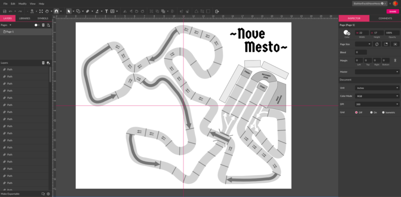 I use a tool called Gravit designer, in which I start with a file that has all basic shape, path and text elements required for the tracks.