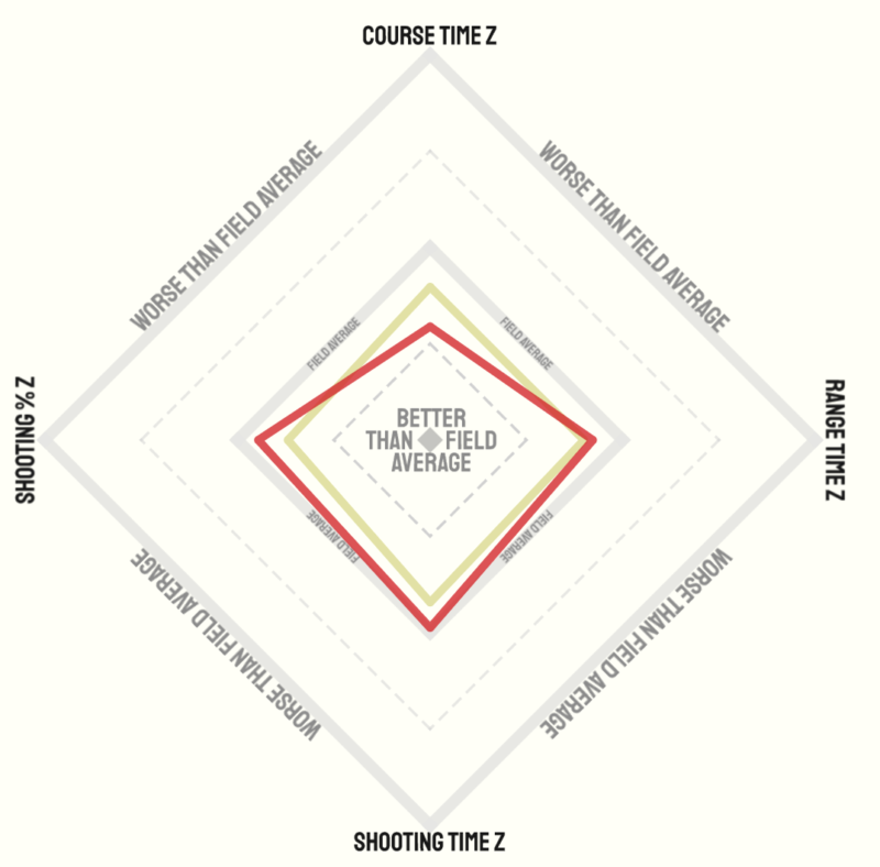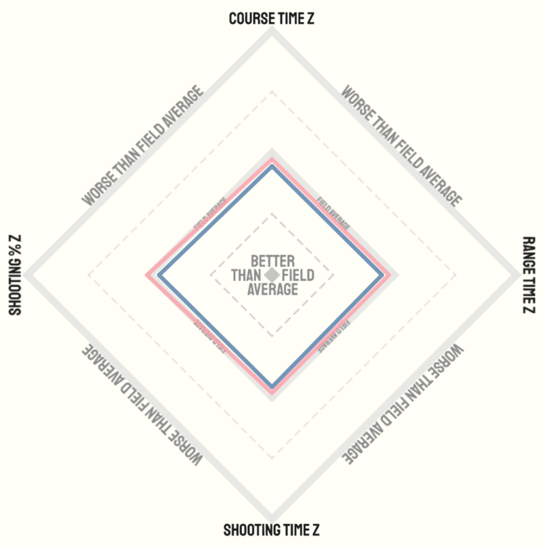 Let’s just assume two athletes were really close in World Cup points with one more race to go. Wouldn’t it be nice to compare different statistics between the two of them? Radar charts are meant for just that particular situation! Every axis leg on a radar chart represents one statistic. And the position on that axis leg represents one of the athletes. You then connect the dots per athlete and boom! you have a Radar chart. Now if we add a line representing the Field Average and assume the inside that line is good, and outside of that line bad, and we can do some comparisons!