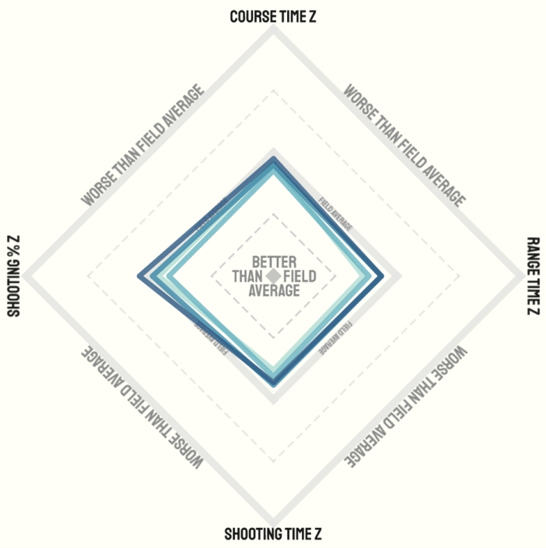 We can see here that SH Laegreid is faster than JT Boe for Z scores in shooting percentage, shooting time and range time, but that JT Boe is faster than SH Laegreid in the course time. On the women’s side, Eckhoff and Wierer show a very similar view: