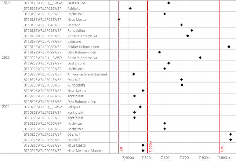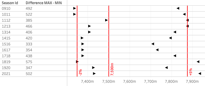 The difference this season between the shortest (Kontiolahti, 7,432m) and longest (Oberhof II, 7,934) is 502m! And that difference is no exception, as we find when looking at the shortest and longest tracks per season:
