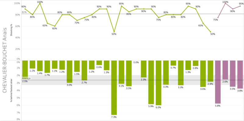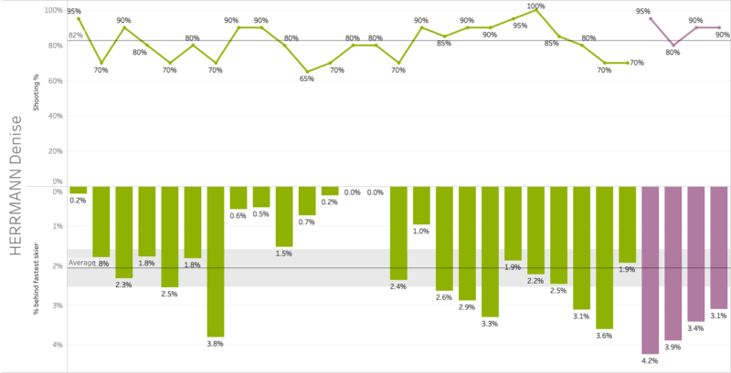 It is an understatement that Herrmann’s previous season was disappointing, but based on her races in Oestersund Herrmann seems to be on her way back. With excellent shooting for her and improving ski speed, can she regain her form with which she won the 2019-2020 world cup sprint globe? With her ski speed still being under her average of the previous and current season, an improvement can be expected there. And if she then can keep shooting the way she was in Oestersund, contention for top spots are definitely within reach for Herrmann.