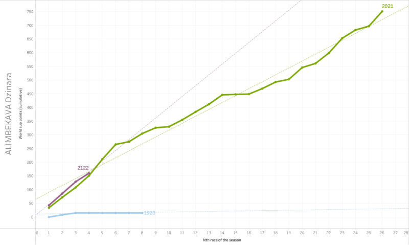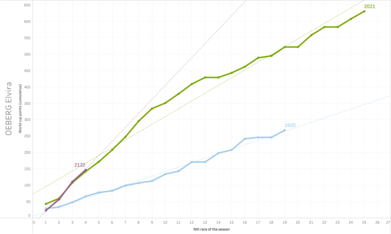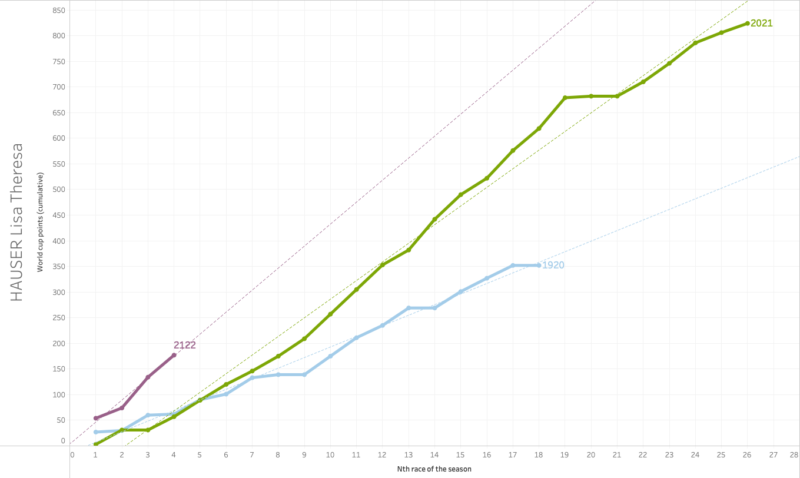 When we compare Hauser’s world cup points after four races to her previous two seasons’ four races, we can see that she is on a trend that will improve her final standing significantly if she can keep up this pace. It’s a bit early to say after only four races, but in any case, she is off to a great start of her season!
