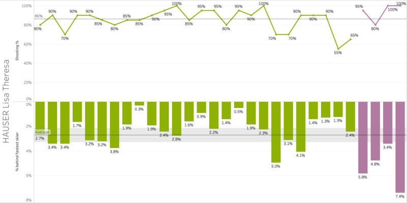 It is hard not to start with the current leader of the World Cup, and Hauser had some impressive races in Oestersund. And that with a ski speed that was slower (relative to the fastest skier) than her average based on the current and last season. Her shooting was top-notch and even above her already strong average of 86%. The chart below demonstrates these statistics per race event with the 2020-2021 season shown in green and the current 2021-2022 season shown in purple.