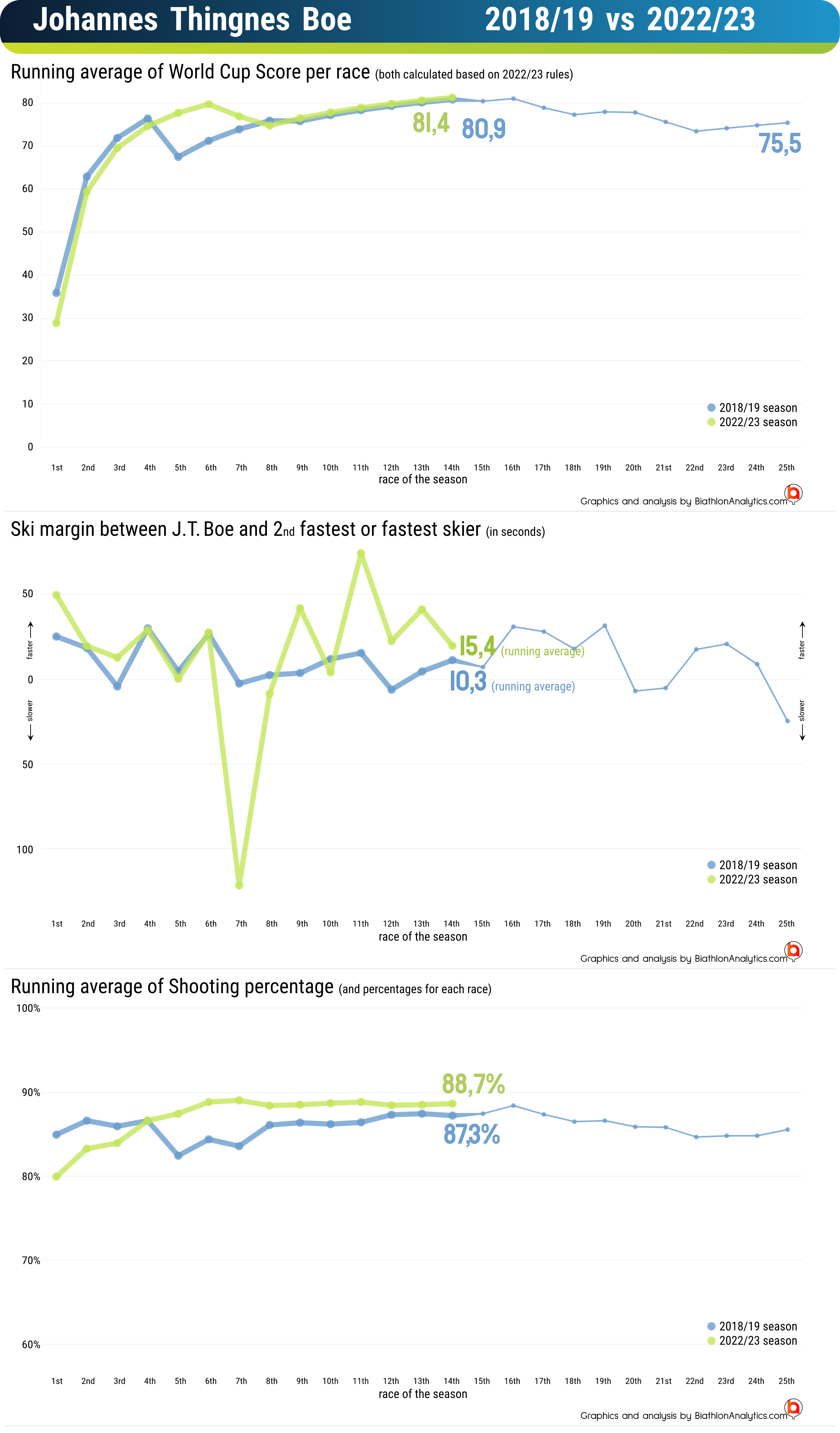 Based on data analysis from Trimesters 1 and 2, JT Boe is unbeatable in the Sprint if he hits nine targets (or 10) because his combined skiing time, shooting time, pursuit start time, and penalty loop time (with by far the most considerable contributor his skiing) averages give him a 37.4-second (279 meters) advantage over the closest challenger – Sturla Holm Laegreid – before the competition begins.