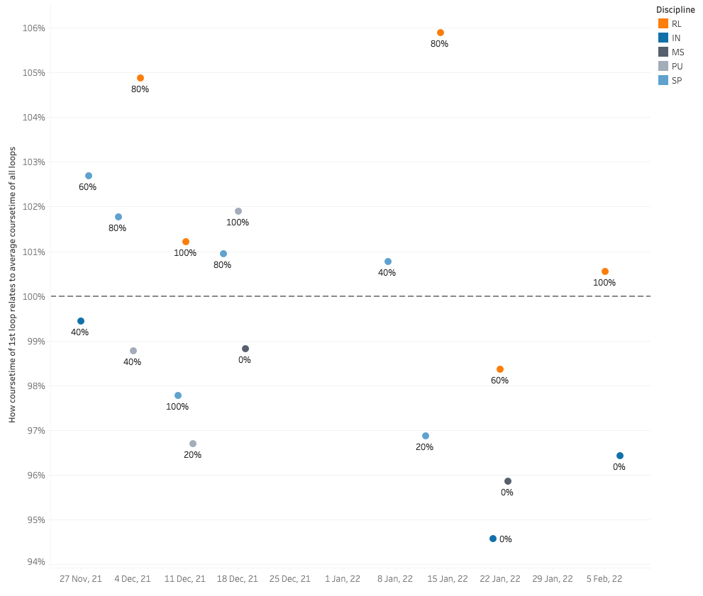 The following chart shows all of Vitozzi’s races in the current season so far, represented by a coloured dot. They are ordered by date on the horizontal axis, with the older races on the left and the most recent on the right. The vertical axis shows how the course time of the first loop relates to the average course time of all loops. Below 100% is a faster loop, above 100% a slower one. The labels show her shooting percentage for the first shooting of that race.
