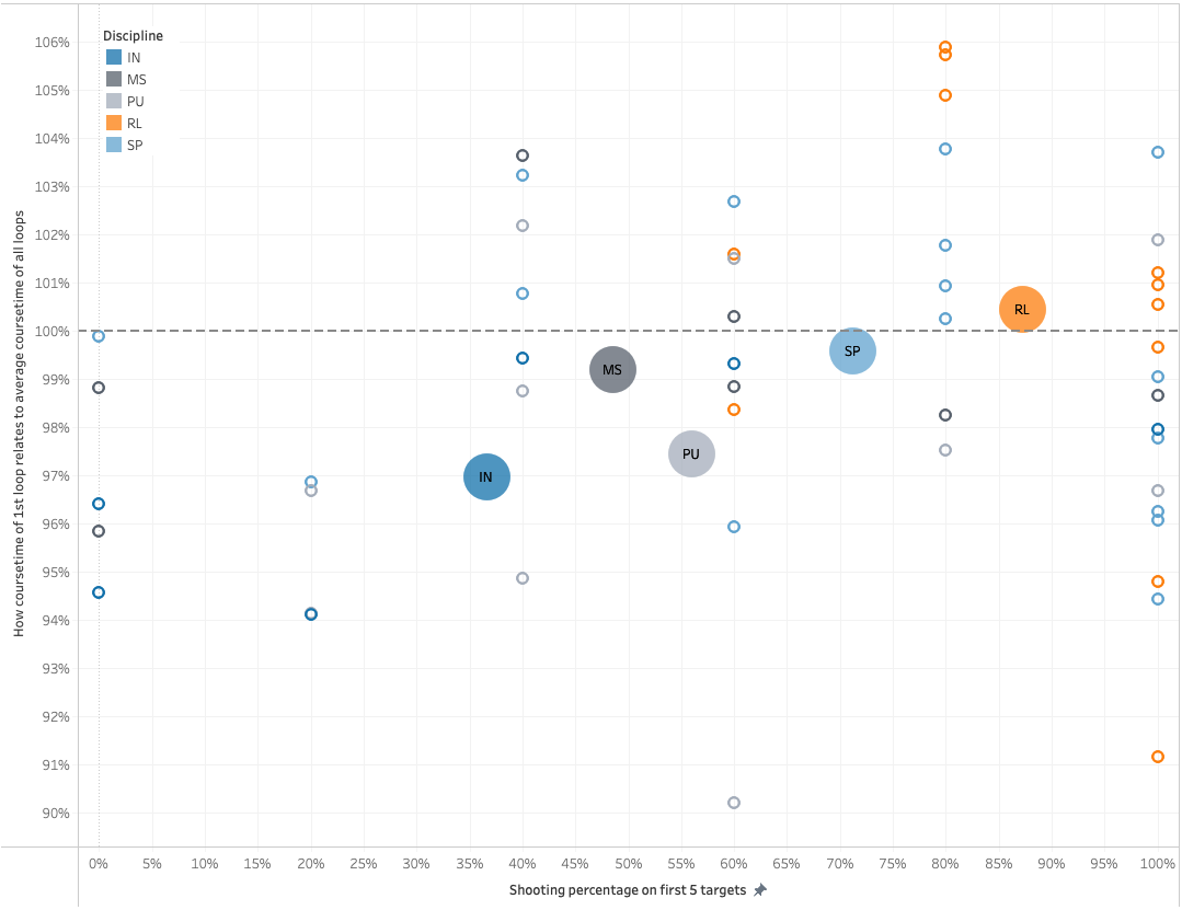 The relays, in which on average she starts her first lap slower than her average lap time, she shoots between 85 and 90%. But in all the other disciplines she starts faster (on average) than her average lap time and shoots worse.