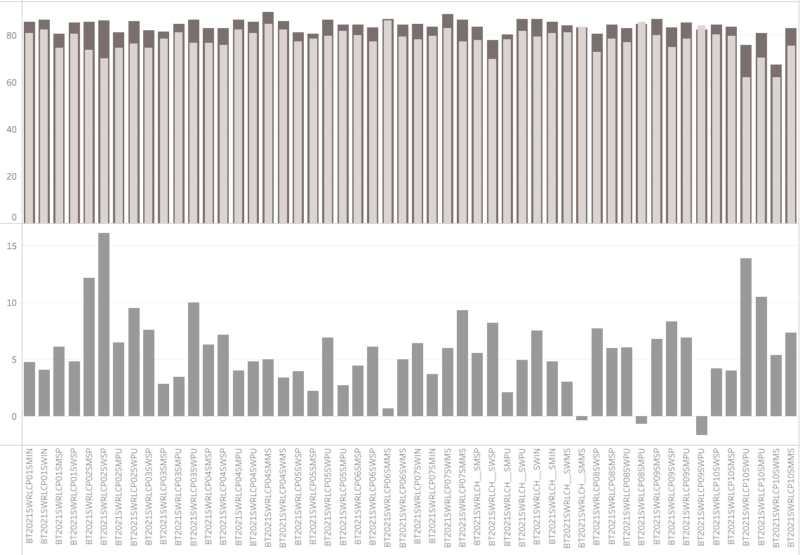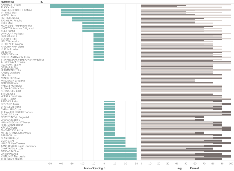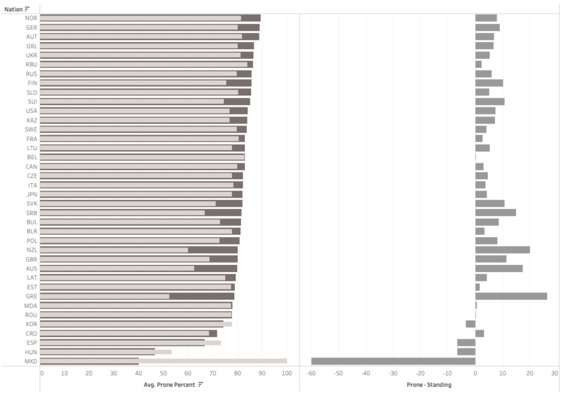 Ok, so in general athletes shoot better while in a prone position than when standing, but does it vary per nation? The chart below looks at the two percentages and shows the difference between prone and standing, resulting in a negative value if the standing shooting is better. The chart below is sorted with the best shooting percentage at the top and the lowest shooting percentage at the bottom. This shows that there are only a few nations whose standing shooting is better than prone, but they are all at the bottom of the chart, meaning that in general, their shooting is not very good. They are also “small nations” when it comes to the sport of biathlon.