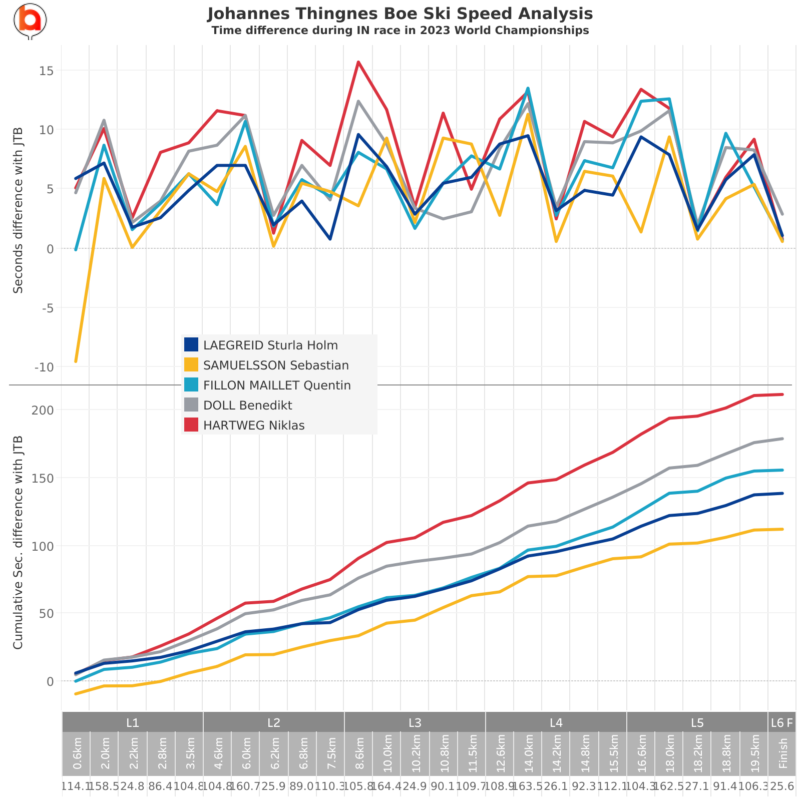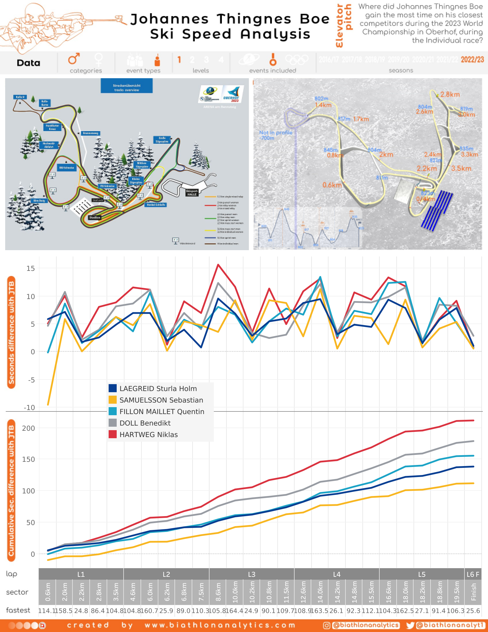 Elevator pitch Where did Johannes Thingnes Boe gain the most time on his closest competitors during the 2023 World Championship in Oberhof, during the Individual race?
