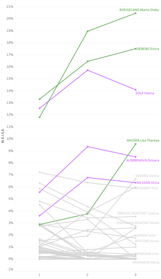 In this example, we are looking at all sprint races for women in the 2021-22 season. We then average each athlete’s Win Expectancy per lap. From this, we can see that for athletes like Roeiseland, Elvira Oeberg and Hauser the Win Expectancy increases towards the end of the race. On average, Sola, Alimbekava and Nilsson’s Win Expectancy declines in the last lap.