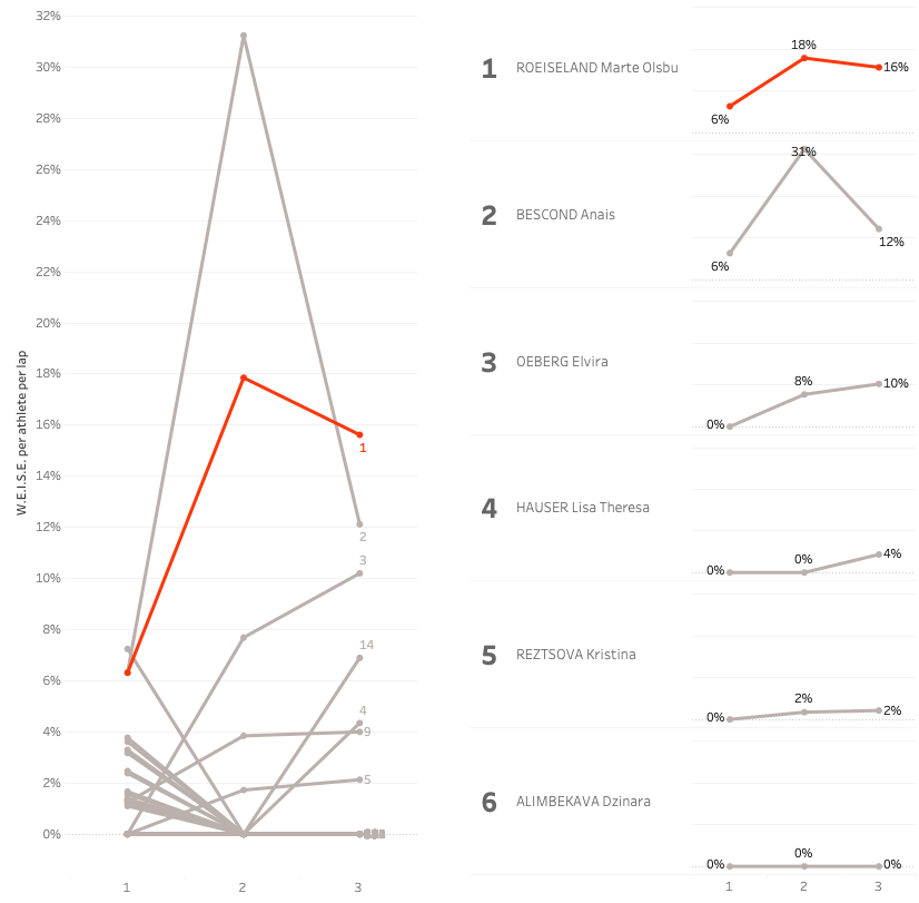 A tool like the Win Expectancy Index only makes sense if there is actual value in using it. Personally, I think it is very interesting to just look at the index, but I can imagine there are not too many people who share that passion for biathlon, data and data visualization. Below are some practical examples of how the Win Expectancy Index can be used to analyze athletes and races.