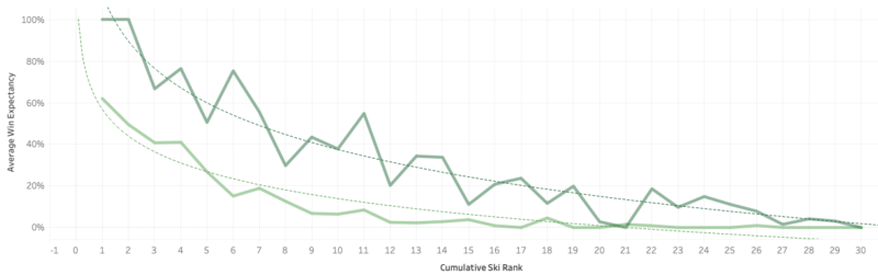 In my last article, the introduction of W.E.I.S.E., I introduced the process for creating the calculation of the expectation of winning, based on historic results with identical combinations of discipline, gender, race lap, the cumulative number of misses and cumulative ski time rank. After further developing the WEISE, this article demonstrates some practical uses of this Win Expectancy Index (WEI).
