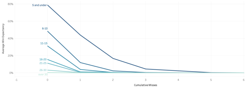 The trend of Win Expectancy per ski rank (group) as misses increase
