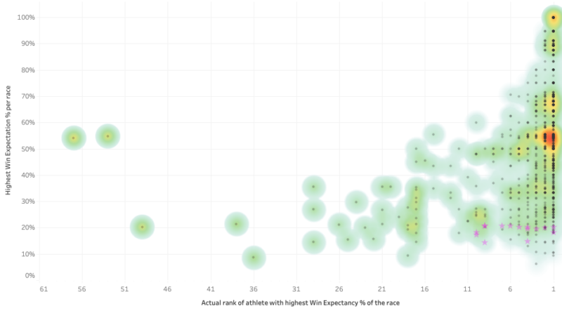 For biathlon viewers and fans, we can look at races where the highest value for Win Expectation (all athletes) during the race was 20% or less (a close pack). And within that group, the number of athletes that had that highest value of WE at some point during the race. If those numbers are 2 or more in sprint races or 4 or more in all other races, we then look at the final rank of the athlete(s) with the highest WE. If that was 10 or better we highlight the races with a pink star:
